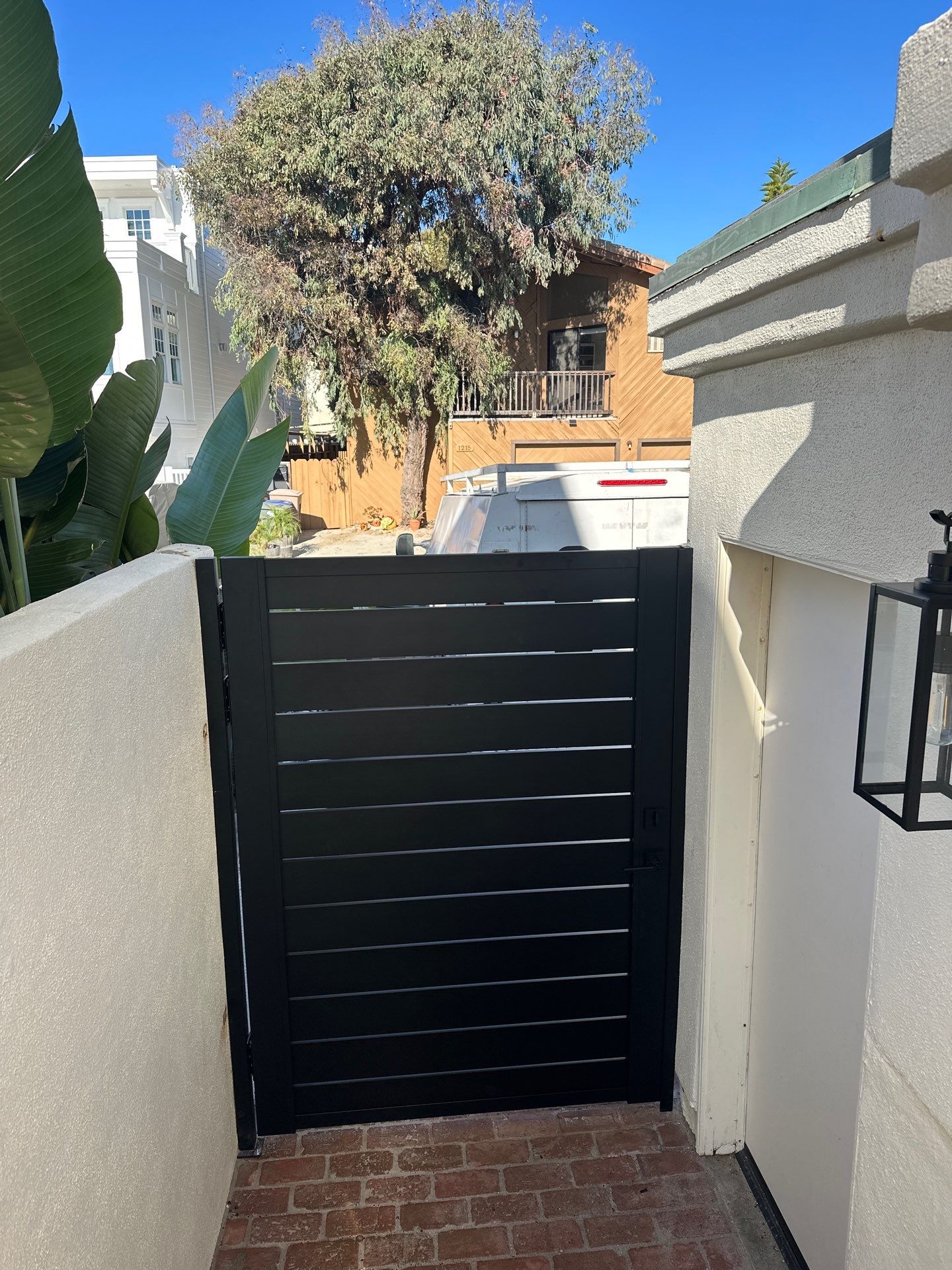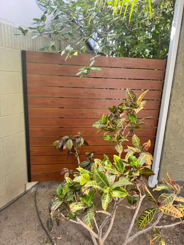 The fence integrates seamlessly with modern exterior materials and can function as both a privacy upgrade and a decorative architectural feature.
